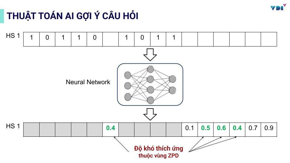 Thuật toán cốt lõi của hệ thống là mô hình Neural Network – Knowledge Tracing. AI dự đoán xác suất học sinh trả lời đúng câu tiếp theo, từ đó gợi ý câu hỏi tối ưu: đủ vừa sức để không gây quá tải nhưng vẫn đủ thử thách để thúc đẩy tiến bộ liên tục.
