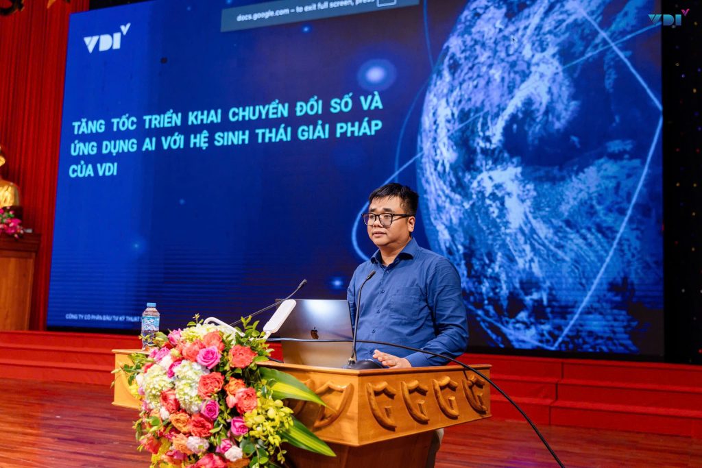 Tại phiên tham luận, ông Đinh Tuấn Phong – Phó Tổng Giám đốc Kỹ thuật VDI đã có phần chia sẻ với chủ đề “Tăng tốc triển khai chuyển đổi số với hệ sinh thái giải pháp của VDI”. Trong bài trình bày, ông nhấn mạnh vai trò của hạ tầng số và trí tuệ nhân tạo trong việc xây dựng chính quyền số, kinh tế số và xã hội số. Đại diện VDI đề xuất hai hướng phát triển trọng tâm gồm: phát triển hạ tầng AI/HPC nhằm xây dựng trung tâm dữ liệu AI hiện đại, cung cấp năng lực tính toán mạnh mẽ cho nghiên cứu và ứng dụng; đồng thời phát triển các ứng dụng AI thực tiễn như: Trợ lý ảo AI và Chatbot tra cứu dữ liệu, giúp cán bộ, cơ quan hành chính và doanh nghiệp khai thác thông tin nhanh chóng, chính xác, nâng cao hiệu quả làm việc.