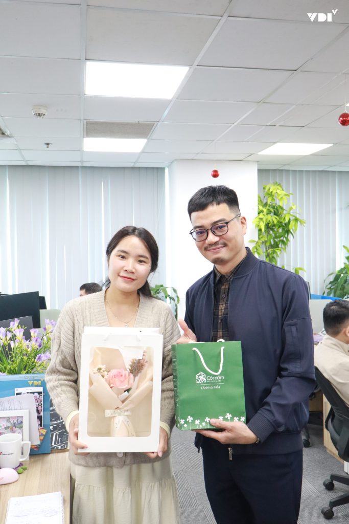 Chương trình chào mừng Ngày Quốc tế Phụ nữ 8/3 tại VDI diễn ra trong không khí ấm áp và thân thiện. Đại diện công ty cùng các đồng nghiệp nam đã gửi tặng những món quà nhỏ cùng lời chúc tốt đẹp tới toàn thể chị em, thay cho lời cảm ơn và sự trân trọng đối với những đóng góp tích cực trong công việc cũng như trong các hoạt động tập thể.